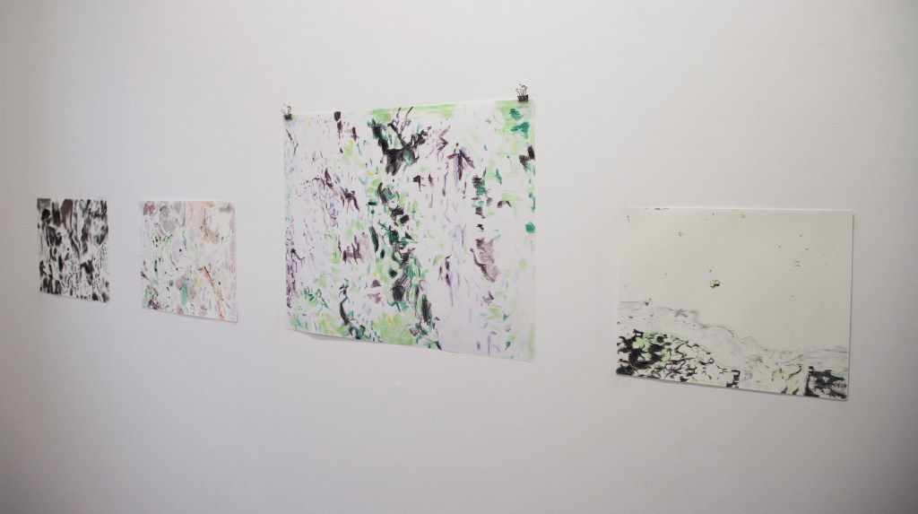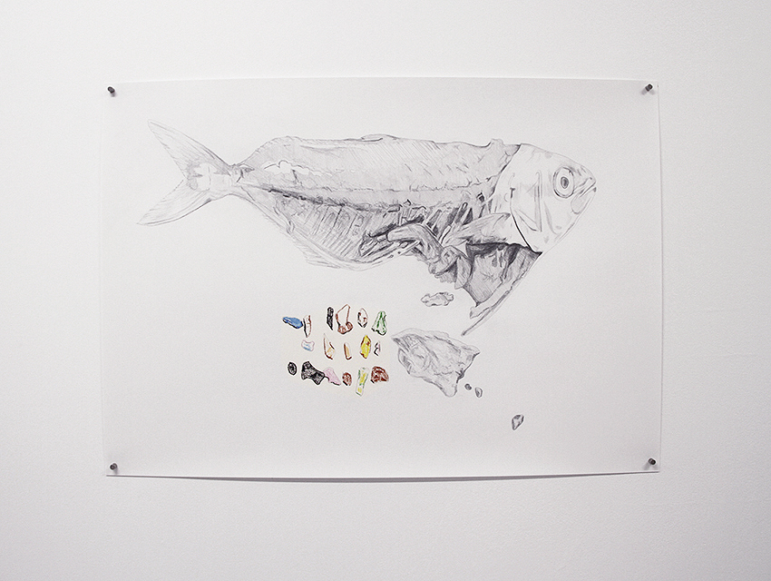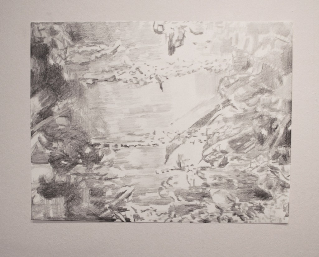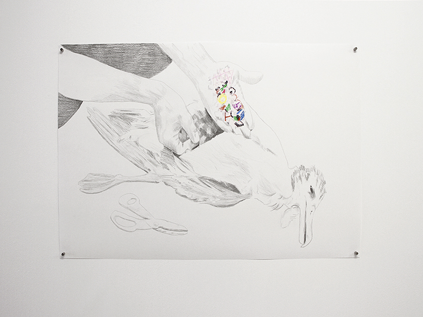 Pencil, colour pencil and crayons on paper.